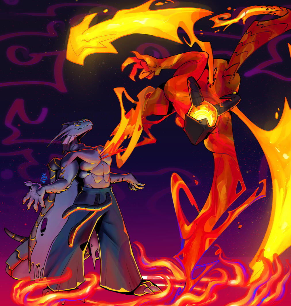 An AU between my partner and me, featuring Jayce as a biomechanical weredrake and Viktor in his hybrid arcane form. For the JayVik monsterfuckers in the crowd.